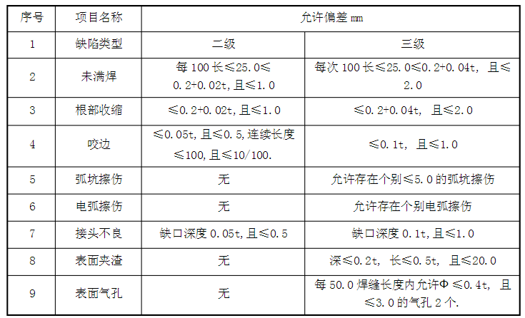 5、鋼結(jié)構(gòu)焊接:焊條、焊絲、焊劑等焊接材料與母材的匹配應(yīng)符合設(shè)計(jì)要求及現(xiàn)行行業(yè).標(biāo)準(zhǔn).《建筑鋼結(jié)構(gòu)焊接技術(shù)規(guī)程》JGJ81 的規(guī)定,焊條、焊絲、焊劑在使用前按其說明書及焊接工藝的規(guī)定進(jìn)行烘焙和存放。焊工須持證上崗,在其認(rèn)可范圍內(nèi)施焊,焊接時(shí)采用合理的焊接工藝,以減少由焊接產(chǎn)生的變形和應(yīng)力,確保焊縫和構(gòu)件的質(zhì)量。本工程零部件連接處均需滿焊,焊縫厚度按設(shè)計(jì)要求,焊接時(shí),盡量減少接縫數(shù)量,拼接應(yīng)按等強(qiáng)度連接原則,選擇合適的焊接工藝和剖口形式,并設(shè)置在預(yù)應(yīng)力較小部位,焊縫表面不得有裂紋、焊瘤等缺陷,表面無氣孔、夾渣、弧坑、電弧擦傷等缺陷,焊縫不得有咬邊,未焊滿根部收縮等缺陷,力求做到外形均勻,成型較好,焊縫與焊縫,焊縫與基層過渡平滑,焊渣和飛濺物須清理干凈,二、三級(jí)焊縫處外觀質(zhì)量標(biāo)準(zhǔn)見下表: